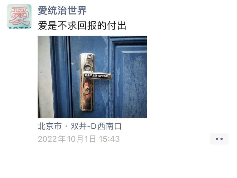 “愛统治世界”在今年9月2日发出第一条贴的爱,正式开始了这个事情,现在已经贴出去461条了。