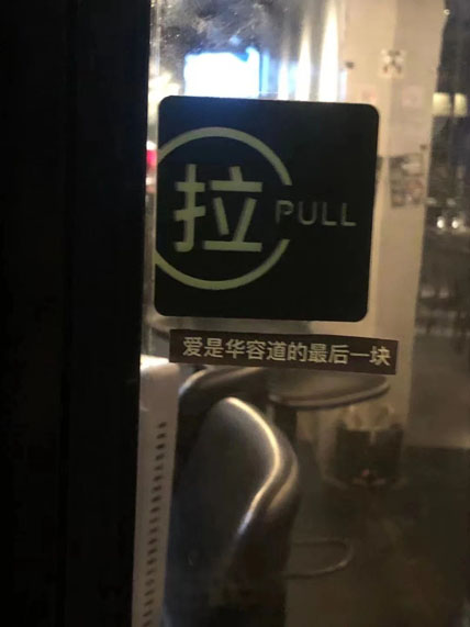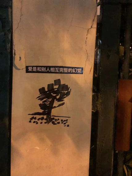“爱是华容道的最后一块”被贴在了北京的一个叫盲区的酒吧里,这句话是一句歌词,这首歌的乐队主唱就是酒吧主理人之一,意义更特别了。