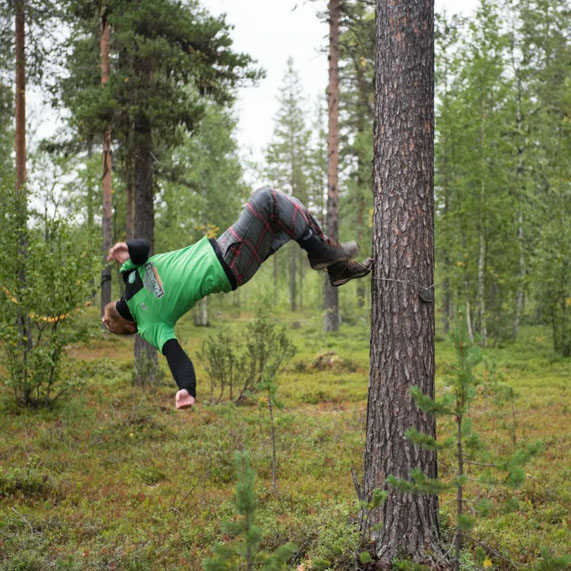 最后一个项目是“自由式”(Freestyle),顾名思义就是让参赛者发挥创意,用任何能想到的方式拥抱大树,随你脑洞大开。说是比赛,其实更像是一场野外的木屋派对,第一届选手加上摄影师、评委和其他工作人员不过30来人,选手有当地人也有久居芬兰的老外。你能在比赛中看到各种画风奇特的抱树方式,腾空抱、倒着抱、躺着抱,甚至一边吃着烤肉一边抱……