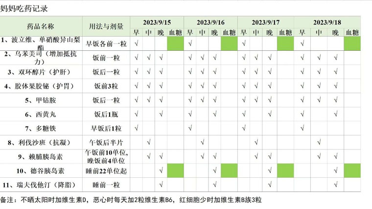 母亲在化疗期间的吃药记录,我打印好贴在冰箱上,我爸负责日常打勾。