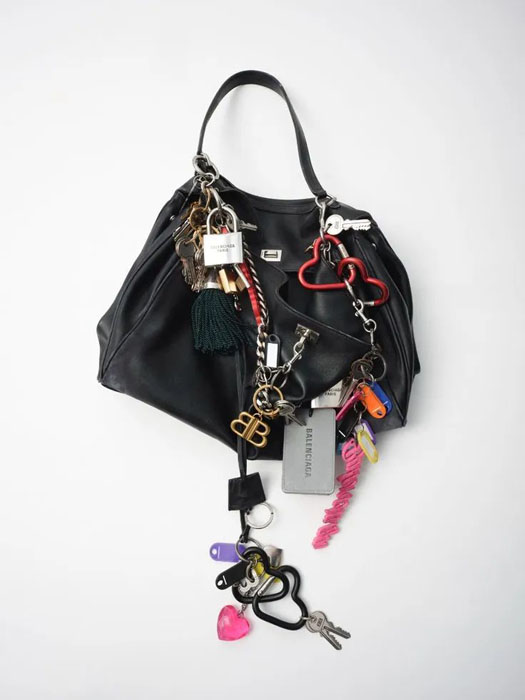 而巴黎世家包挂,更加“亚”文化一些。在今年超火的Rodeo包上,密密麻麻挂着锁头、钥匙、登山扣、钥匙链铭牌......把原本装在包里的东西统统掏出来“展示”。