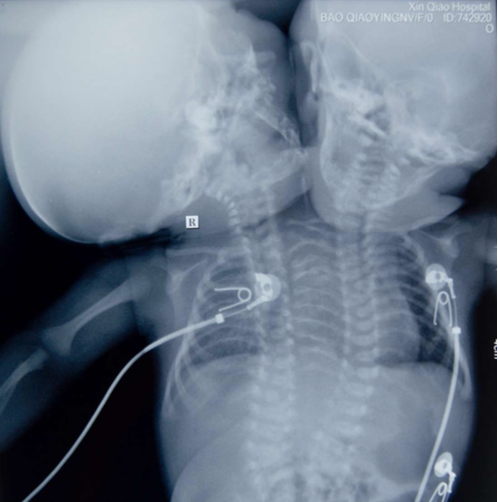 5月10日,新桥医院对双头婴做了全面检查。结果显示,双头女婴有两个头颅、两套脊柱系统、两个食道、两个胃、两根气管、两个肺、两个肾脏、一个半心脏,共用躯干、胆囊、脾脏、骨盆、膀胱、生殖系统。两个头完整,颅骨发育基本正常,智力基本正常,左侧更好一些。由于两个头紧挨着,只要有一个头发出声音,另一个就会受到影响。