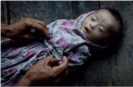 图说:五个弃婴躺在草垫子和脏被褥铺就的床上,有的在玩耍,有的仍在昏睡,床头的蜂窝煤垒得很高,一不小心就会被碰到床上。这是在河南兰考县人袁厉害的一个住处,袁厉害从1987年开始收留残疾或有病的孩子,25年来前后收养的孩子超过100个,部分孩子因为没有足够的医疗救治而病重死去。