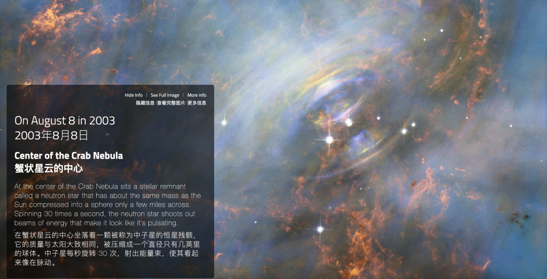 哈勃空间望远镜可以探测的灵敏程度,相当于在地球上可以看到月球上的一盏4瓦夜灯的光亮,好比在日本东京看到一只位于美国华盛顿的萤火虫。当望远镜绕地球运行时,它收集来自宇宙的光线、图像和数据。从这些来自一年365天的宇宙影像中,我们看到了除了壮丽的光和颜色之外,也有那些被剥离、驱逐、爆炸之后的残骸以及新生..... 宇宙中可以存在多种多样的美感,这或许也是新一年对我们的信号。