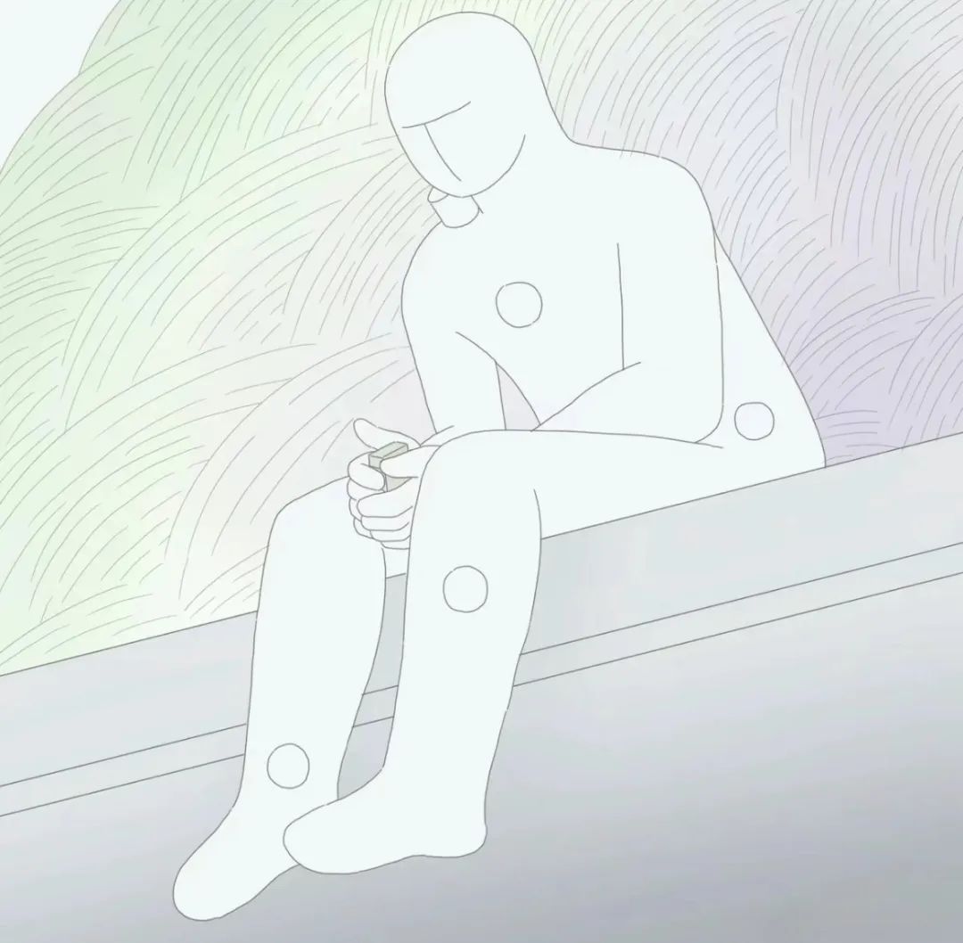 躺在喷泉下的人,就像我们的休息时间也是被规定好的。我去动物园时,看到鸟儿都在一棵树上不会飞走,而那棵树外的天空是很广阔的,鸟儿可以想去哪就去哪,它们为什么不飞走呢?我也有全职做商业插画的经历,但我觉得那样找不到自己。2019年时,我辞职离开了那份工作,也因此诞生了珍珠奶茶人(TAPIOCA MAN)系列。我有一年的时间没有工作,我很喜欢喝珍珠奶茶,当时出门的理由好像只有去买奶茶,即使要走很多路,也好幸福。既然它能让我这么幸福,我就创作了一个珍珠奶茶人。他圆圆鼓鼓的,没有眼睛和五官,他的存在介于现实和想象之间,借着他我把自己的故事画出来。生活艰难时,我甚至想过把钱花完就死掉,用这样的想法让自己不要害怕未来,后来在朋友的劝说下,我又回去上班了。有次晚上快十点时,我下班走到地铁口,公司前台给我打电话让我回来,说还有一个熊猫没有画。想到要承担夜晚从公司到家的车费,我在原地哭了半个小时,才回去继续画那只熊猫到凌晨两点。冬天来了,我没有钱买羽绒服,加上住的地方要交暖气费,我就离开了北京。我也意识到自己画得不行,身边同事是从专业美院毕业的,我就暗暗戳戳地每天比对方晚下班两个小时。直到我觉得自己能力够了之后,才开始每天正点下班。我也会画一些轻松的内容,比如我想吃红苹果,就画了下面这组。就好像想做的事情就赶紧去做,拿到新鲜的苹果就赶紧吃一口,不要等回家再吃。喝牛奶时也很快乐,每次喝我都觉得好幸福,就为它画了一组图。2020年时我参加了一场线下艺术节,旁边摊位艺术家的作品都卖光了,而我的却无人问津,这样差的反响让我画不出来了,我也不再强求自己,TAPIOCA MAN系列就停止在了那个时候。有次我在机场等车回宿舍,旁边坐了一个即将乘飞机去旅行的男生,他和我说可以去看一个叫《转山》的电影。当时在机场工作的自己状态是只有年龄在涨,而脑子是空空的。