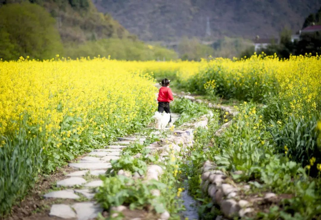 “汉中油菜花田里的孩子跟她的小狗一起在田间的路上奔跑。”