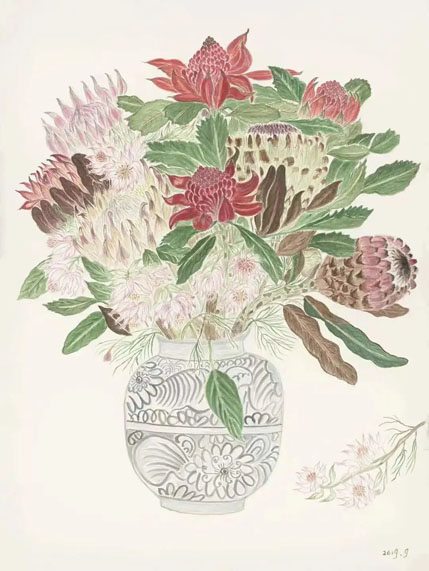 有的花期很短就一两天,好多花买过来很快就枯了。我有次画一个绣球花,它大概不到三个小时整个都耷拉下去了。现在对于不同品种的花,我都有一点底了。哪个花容易枯萎,我就赶紧把花画好,叶子就最后画。